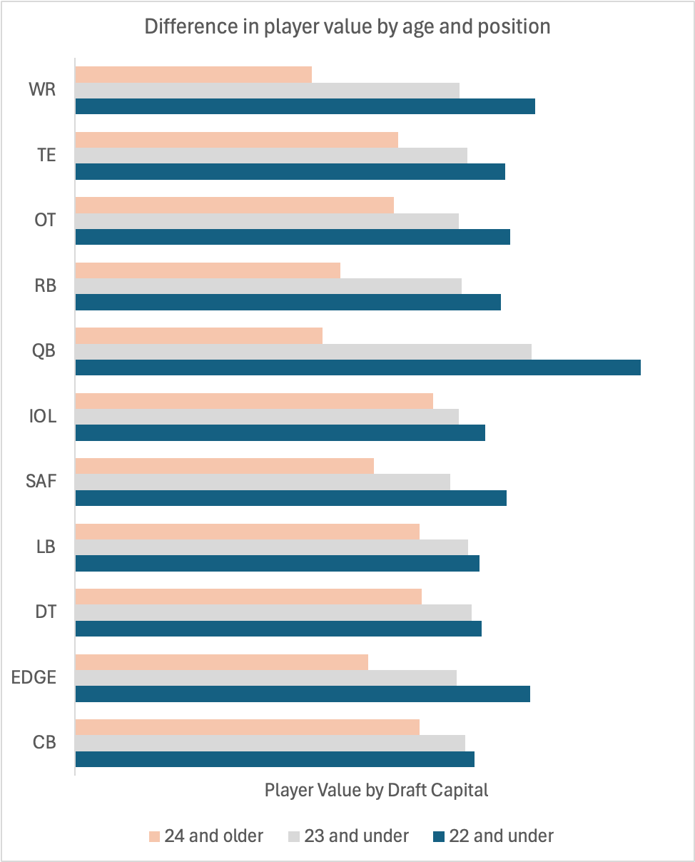 The worst positions to draft older were QB (36% worse for 24 year olds), WR (29% worse), RB (24%), and EDGE (17%)