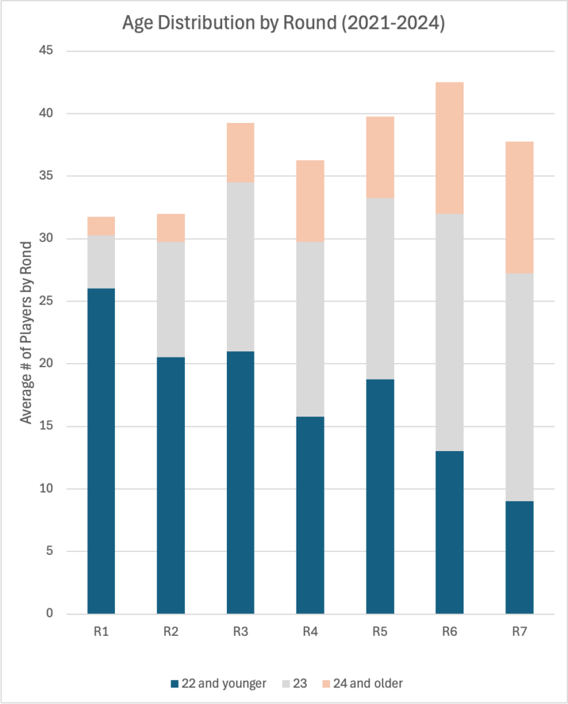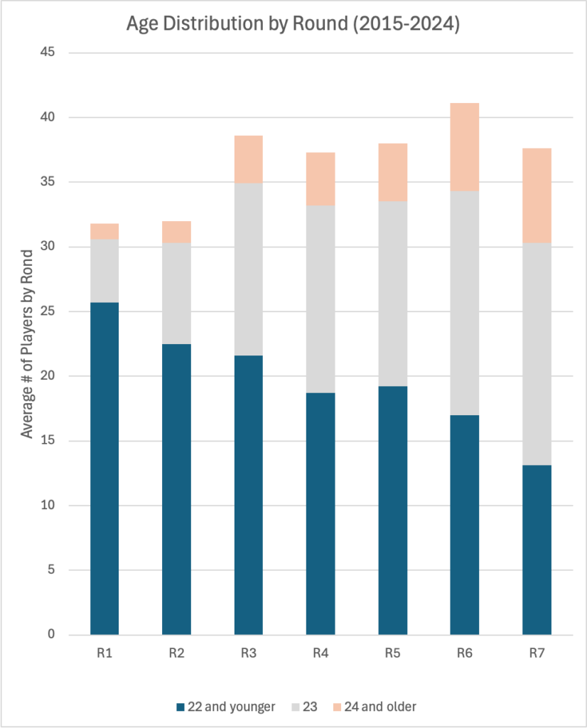 The 1st round is younger, averaging almost 26 picks aged 22 or younger, 5 picks aged 23, and barely over 1 pick a year aged 24 or older