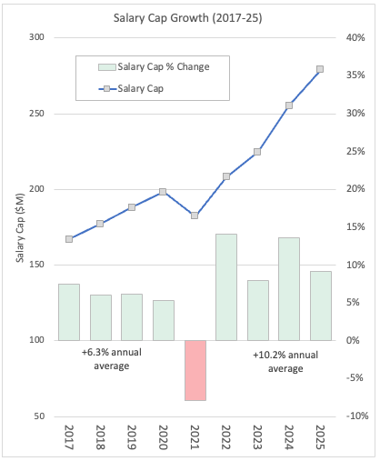 Prior to Covid, the cap increased a bit over 6% a year. After dropping 8% in 2021, the cap has been making up ground, growing 10% a year from 2022-25. A lot of this is due to more and bigger TV deals as the league started signing more channels, but also re-gaining the prior trend that Covid disrupted.