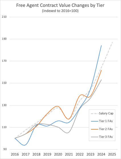 Recently, the prices of the top free agents (tier 1) have gone up faster than the rest of free agency as well as the overall cap - since 2022, the cap has increased 23% but tier 1 free agents have doubled that, up 44%
