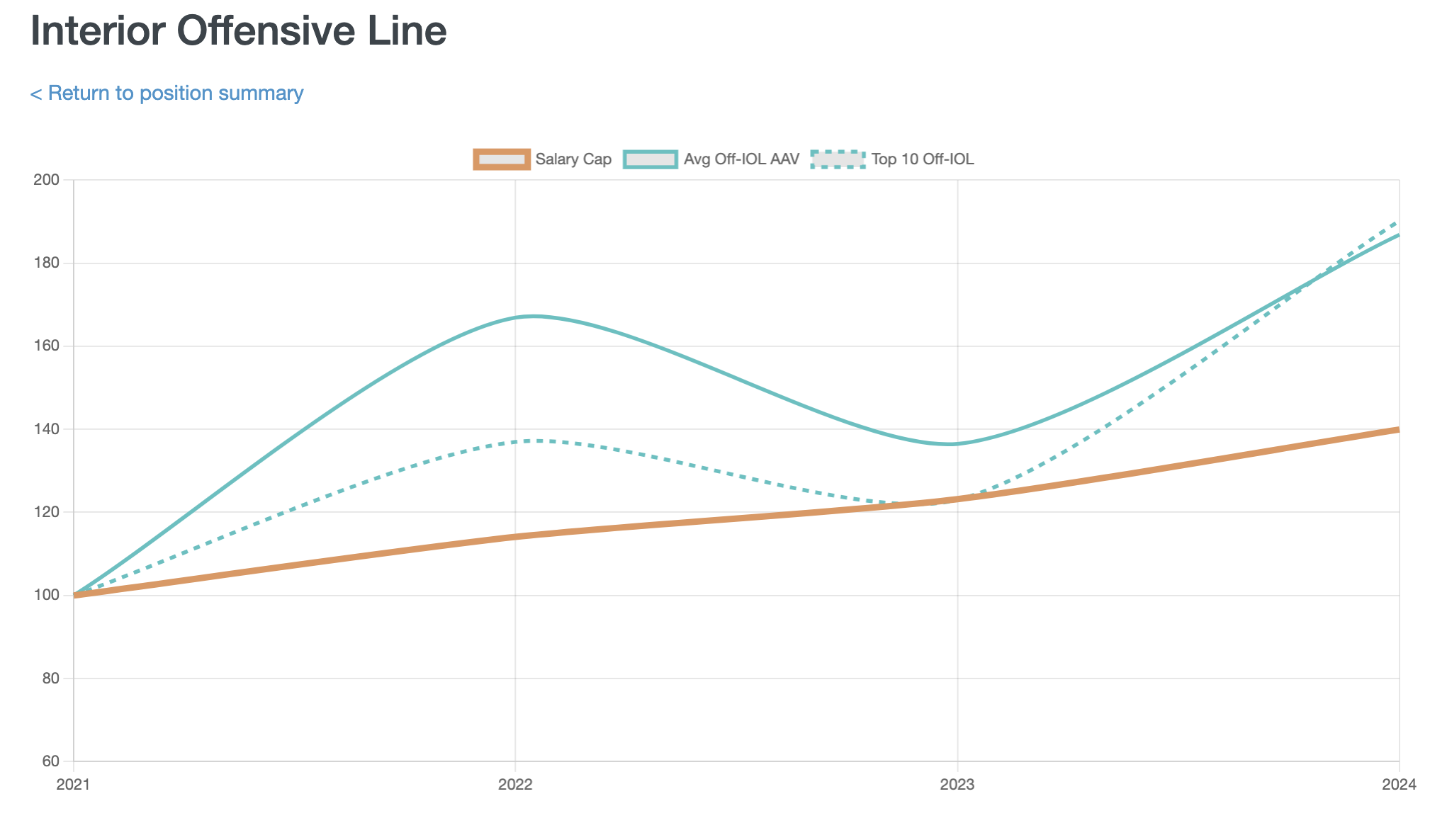 If I had to put money on only one guy, I’d probably bet on Ohio State’s Donovan Jackson who played OG and OT and is known as a great team guy. He could be a future Lane replacement but even if he stays inside, IOL is a position whose positional value has dramatically changed, doubling the overall cap growth since 2021: