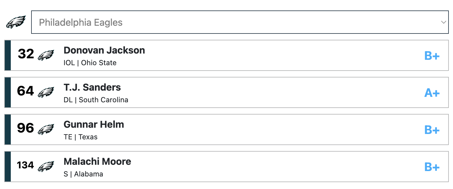 I really expect back-to-back line picks and whatever wasn’t taken in the 1st will be taken now. So if they go Donovan Jackson in the 1st, one of my favorites in this class is TJ Sanders who is projected anywhere from early 2nd to end of the 2nd - if he’s there, I think the Eagles take him as they have shown a lot of interest in him.