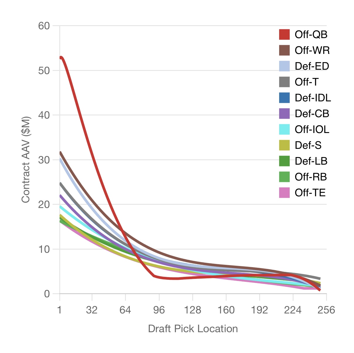The below shows expected contract value (y-axis) by pick location (x-axis) in the draft across the different position groups (and a fully interactive chart with more detail and prior years is available here: https://phillycovercorner.com/draft/insightpickvalue.html)