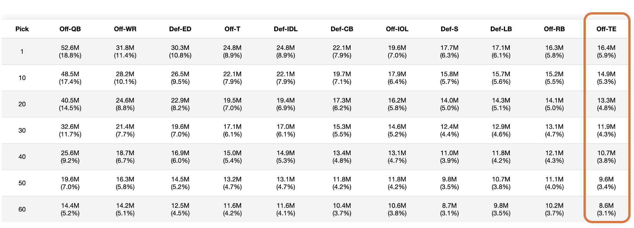Positional value is what a comparable player costs in free agency versus the expected quality you get at that draft slot. By that measure, TE is the lowest-valued position — below SAF, LB, and RB.